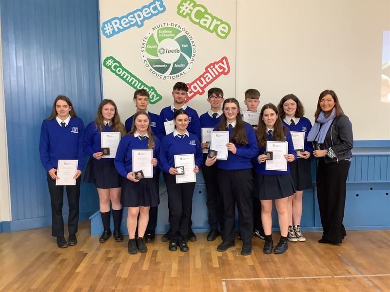 Thursday 23rd February 2023 Dunamase College/Coláiste Dhún Másc celebrated 14 students who successfully completed their bronze and silver Gaisce award. Gaisce Awards are non-competitive and self-directed, so the participants choose their own activities, goals and projects with the support of their President’s Award Leader (or PAL). Mary Yore, our Gaisce regional development officer presented the students with their certificates, badges, and medals. Mary explained to the group that Gaisce is not an award you win but an award you earn. The incoming Transition Year students were in attendance to honour these 14 students. Students will now move on to their next Gaisce award in the coming months. A massive thank you must be given to our Gaisce Coordinator Aisling McAuley and PALs Genevieve, Darragh and Deirdre for the support, guidance and encouragement given to the 14 students on their successful journey. Congratulations to all the recipients, we are very proud of you.